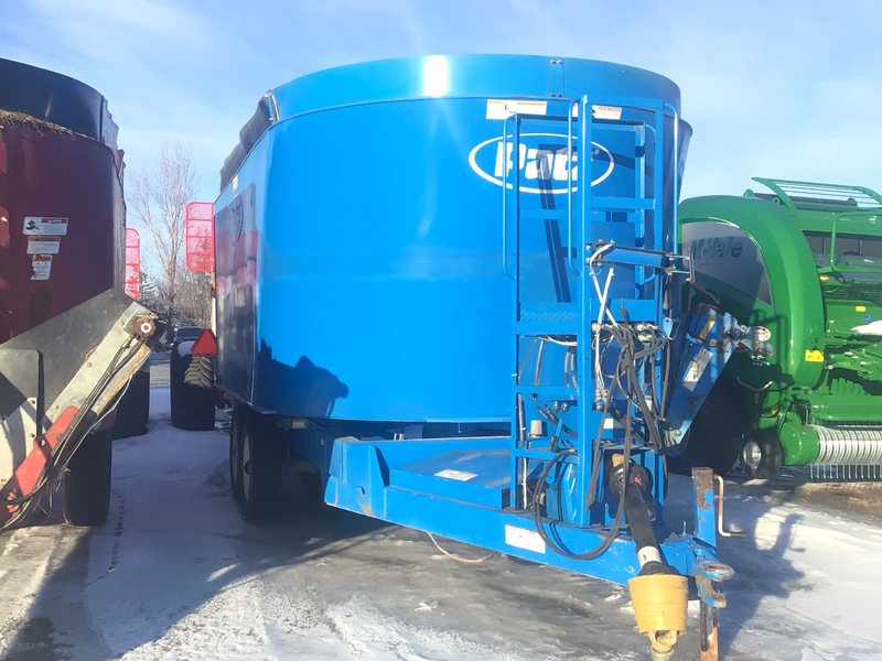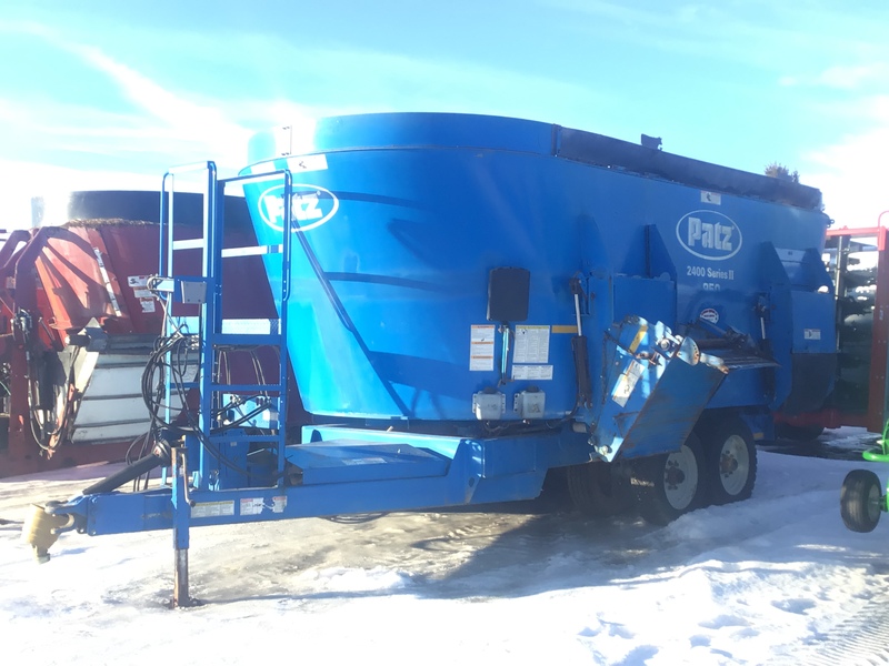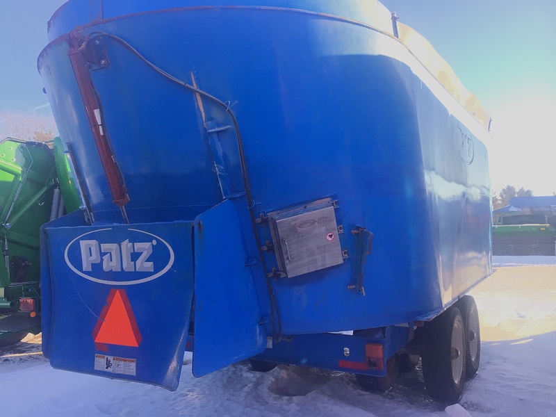 USED VERTICAL TWIN SCREW PATZ 950 MIXER; HAS 3 UNLOAD DOORS; REAR, & 2 LEFT SIDE DOORS.